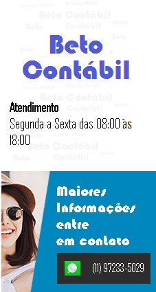 Nosso compromisso é atender as necessidades dos nossos clientes com qualidade, eficiência e rapidez nas soluções para o empreendedor e para a empresa. Maiores informações sobre os nossos serviços entre em contato (11) 97233-5029 Whatsapp ou beto.contabil@bol.com.br